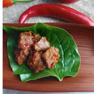 salted Talang fish, fiery red chilies, bird’s eye chilies, shallots and garlic, palm oil ,slice of tamarind.